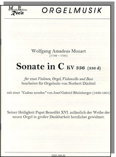 ![]() bearbeitet für Orgel solo von Norbert Düchtel Mit dieser Ausgabe der beliebten und bekannten Mozart'schen Kirchensonate in C KV 336 für Streicher und Orgel solo liegt nun eine Fassung für Orgel solo - also ohne Streicher - vor. Herausgeber Norbert Düchtel verwendet für diese Edition außerdem eine Kadenz, die Josef G.Rheinberger für die Aufführung der Sonate komponierte. Widmungsträger dieser Ausgabe ist "Seine Heiligkeit Papst Benedikt XVI.", anlässlich der durch ihn selbst gesegneten neuen Orgel in der Stiftsbasilika "Unserer lieben Frau zur Alten Kapelle" in Regensburg am 13.September 2006. |